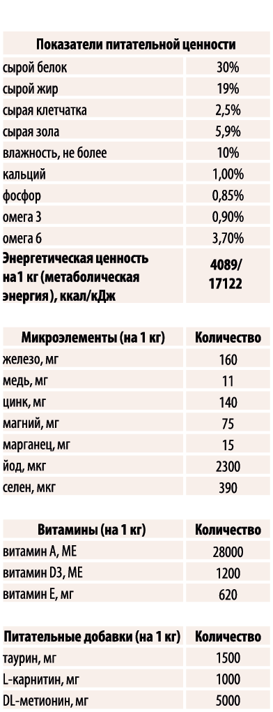 Состав: дегидратированные белки индейки, овес, сорго, жир индейки (сохранен смешанными токоферолами и экстрактом розмарина), картофель, гидролизованные коллагеновые белки, гидролизованные рыбные белки, гороховый протеин, цельное семя льна, комплекс растительных масел, масло лососевых рыб (EPA - 13,1% , DHA - 7,64%), дегидратированное цельное яйцо, гидролизованные мясные белки, автолизат пивных дрожжей (натуральный источник МОS), DL-метионин, экстракт календулы (натуральный источник лютеина), порошок семян подорожника, инулин из топинамбура (источник пребиотиков FOS), L-карнитин, таурин, минеральные вещества, витамины, bacillus subtilis&bacillus licheniformis.