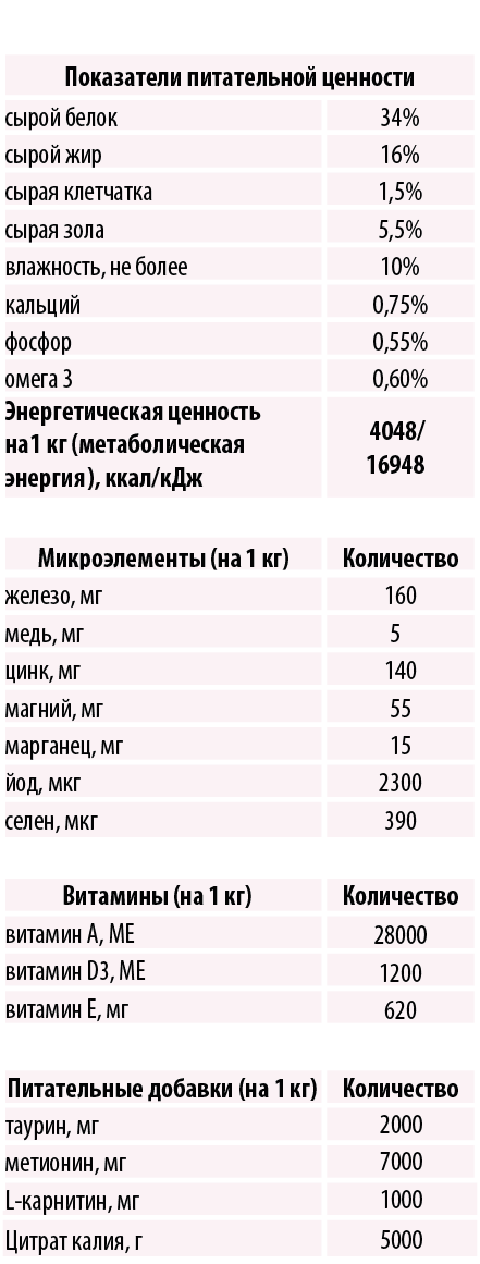 Состав: пшеница, глютен кукурузный, дегидратированные куриные белки, сорго, жир индейки (сохранен смешанными токоферолами и экстрактом розмарина), дегидратированное цельное яйцо, изолят растительных белков, картофель, комплекс растительных масел, масло лососевых рыб (EPA - 13,1% , DHA - 7,64%), гидролизованные мясные белки, автолизат пивных дрожжей (натуральный источник МОS), DL-метионин, сульфат кальция, экстракт календулы, моногидрохлорид лизина, инулин из топинамбура, таурин, витамины и минералы